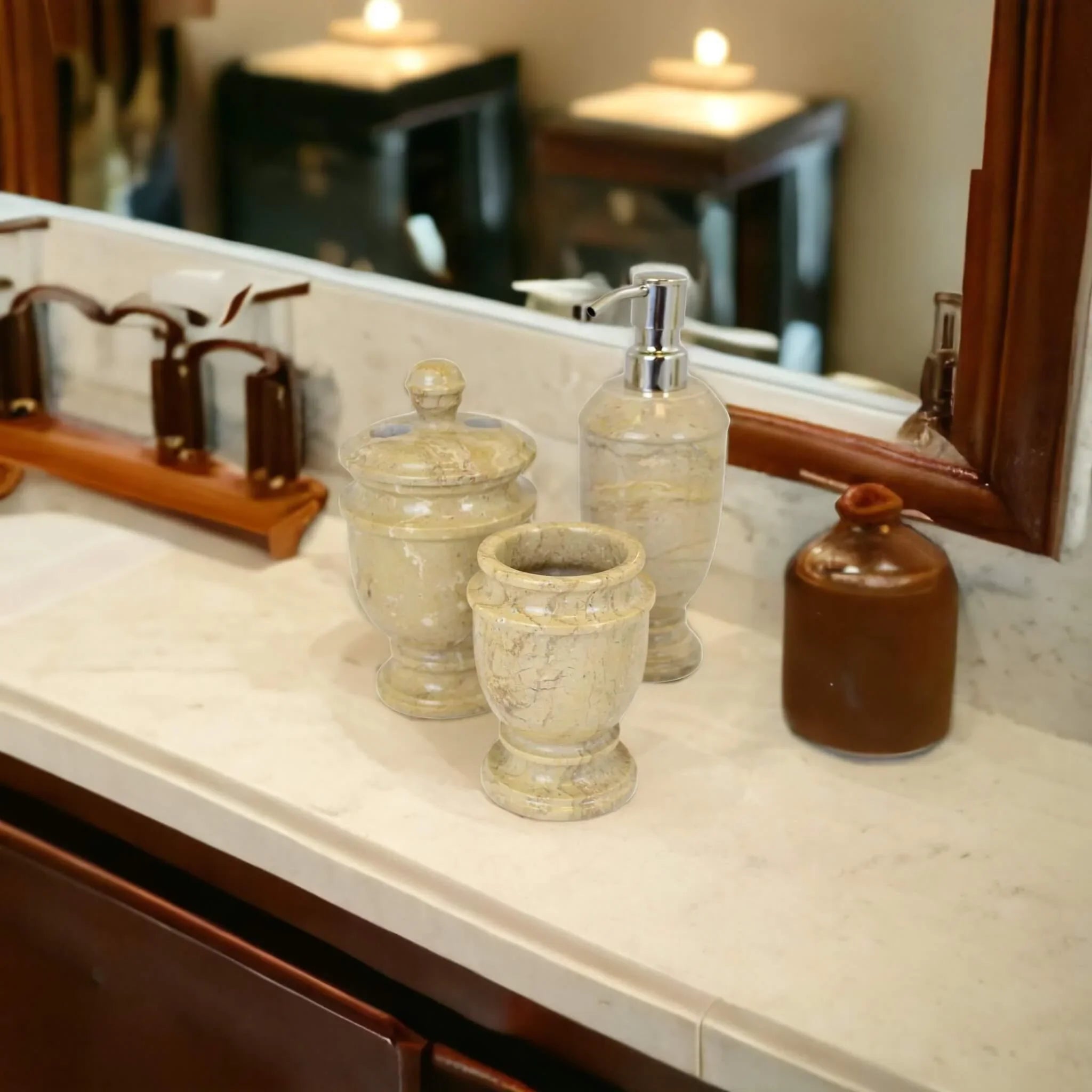 Elevate your bathroom aesthetic with our 3 Piece Bathroom Set. Hand-crafted from Sahara Beige Marble, each unique piece offers a sophisticated, stylish look fit for a luxurious oasis. Transform your bathroom into a world of beauty, elegance and class with our Elegant Bathroom Set. Nature Home Decor brings you the exquisite beauty of natural stone, perfect for adding an air of exclusivity to your home.