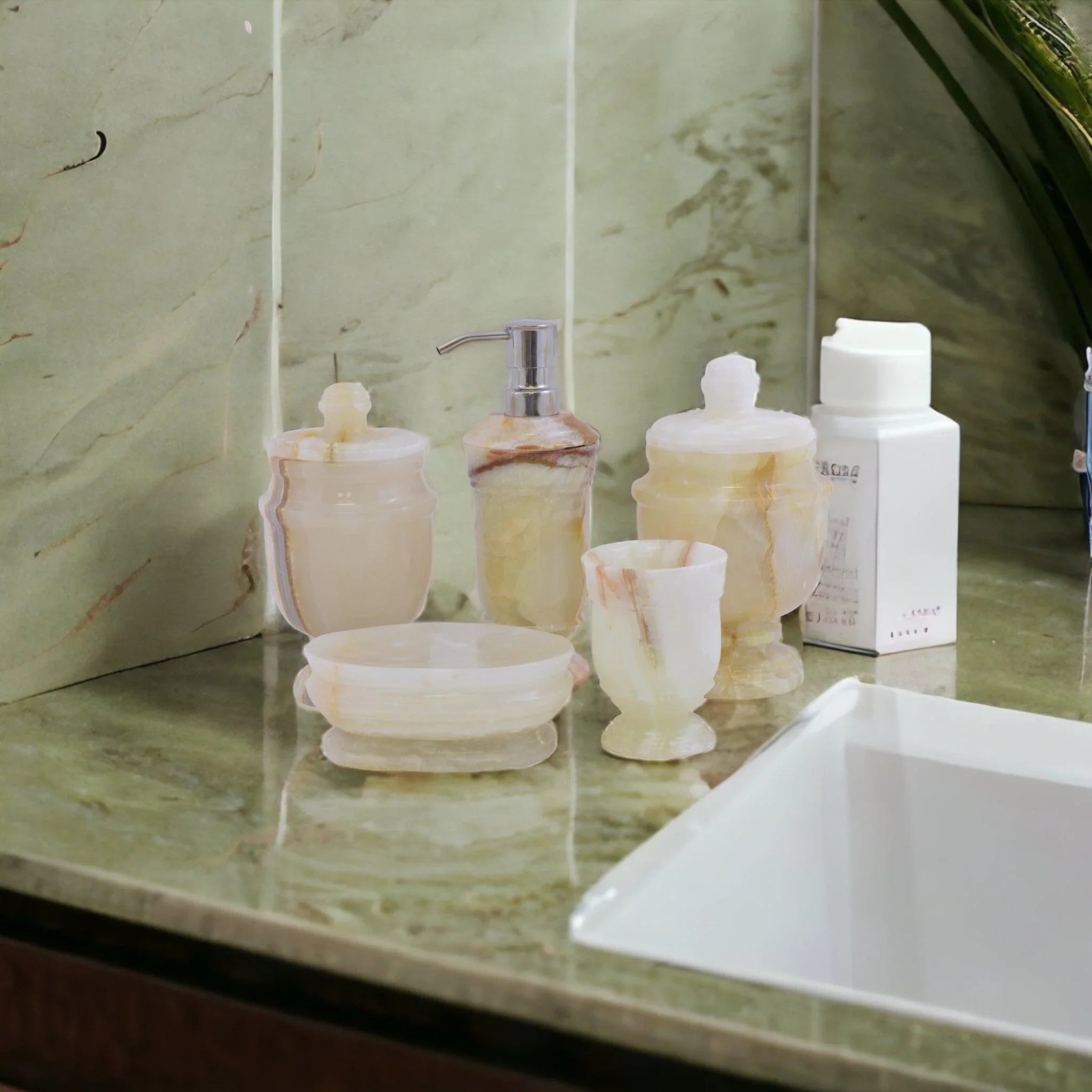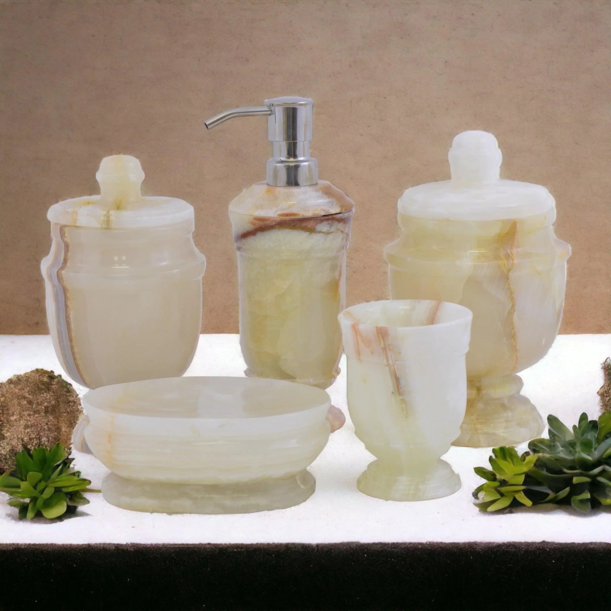 This White Onyx Marble 5-Piece Bath Accessories Set is a sensational choice for any bathroom. You'll adore the polished translucence of the White Onyx, exuding timeless elegance. Get the convenience of the entire set with a tumbler, toothbrush holder, soap dish, liquid soap/lotion dispenser, and a canister/cotton ball dispenser complete with removable bottle. It's a breeze to clean and refill - seize the day and enjoy!