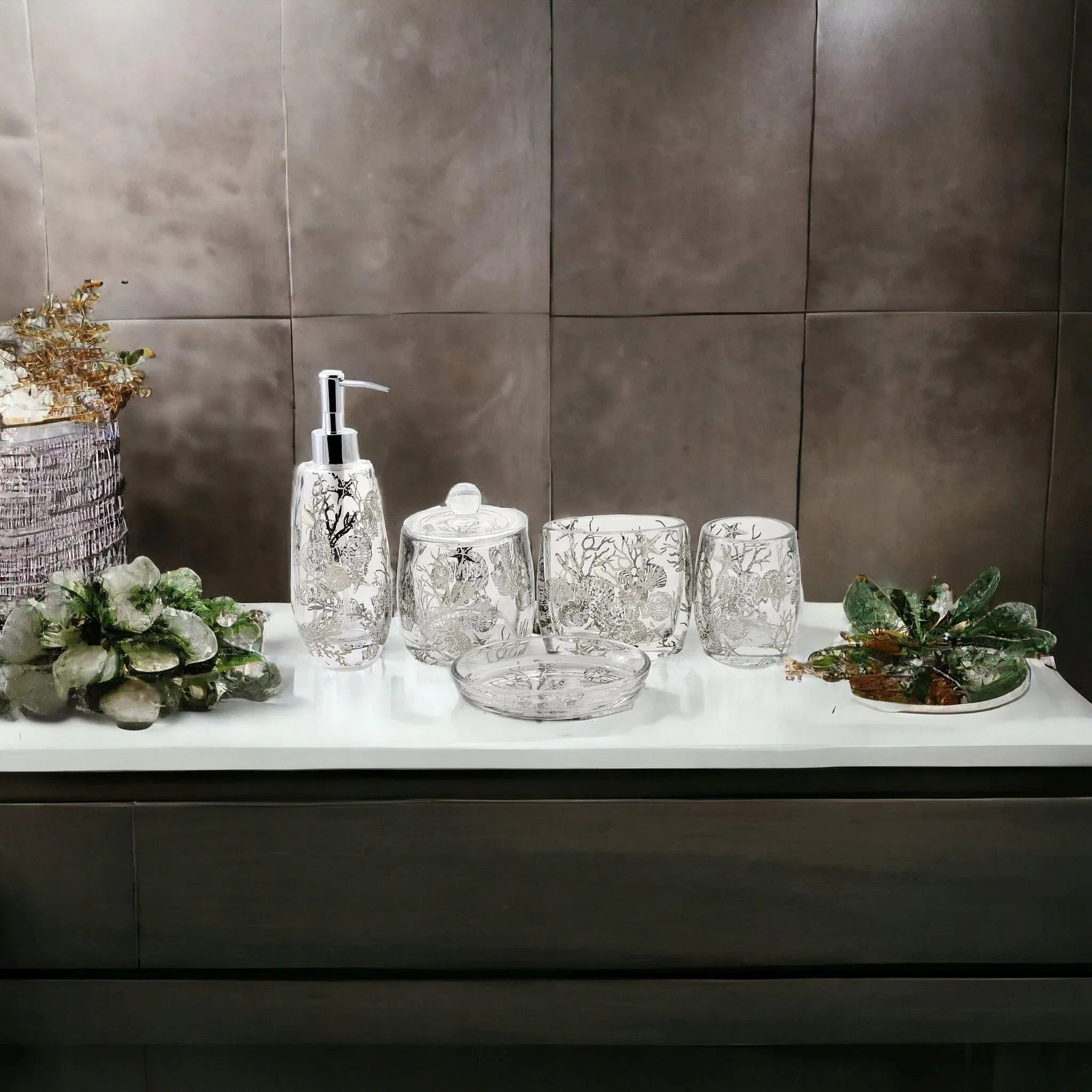 This Antlers Design 5 Piece Bathroom Accessory Set is exquisitely crafted with Angus Glass, and designed to bring breathtaking beauty to your bathroom decor. The unique Antlers theme and luxurious construction ensures durability and elegance making it an ideal addition to your home or commercial use. Enjoy a beautiful, long lasting experience with this splendid set!