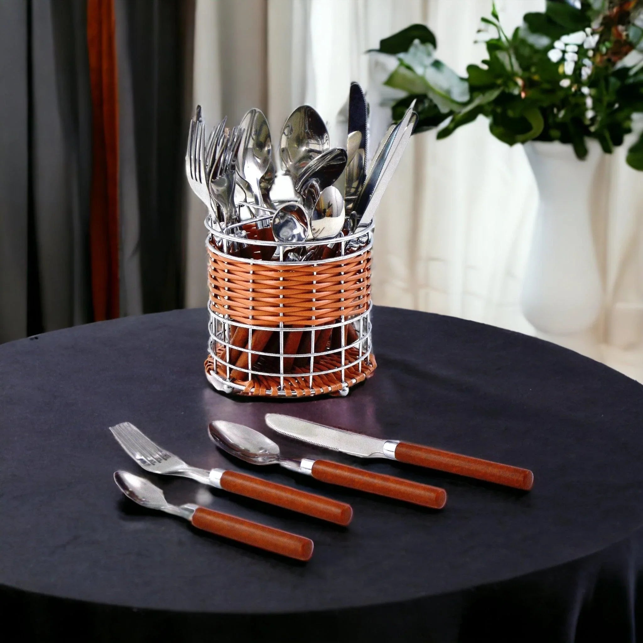 Featuring 24 pieces of high-grade stainless steel paired with luxurious wood-finish resin handles, this Flatware Set adds a sophisticated touch to any modern dining space. Includes a storage and carrying caddy. Ideal for both formal and casual occasions, this Flatware Set elevates your experience, delivering superior style and durability that will last you for years to come. An embossed carrying caddy keeps everything stylishly organized.