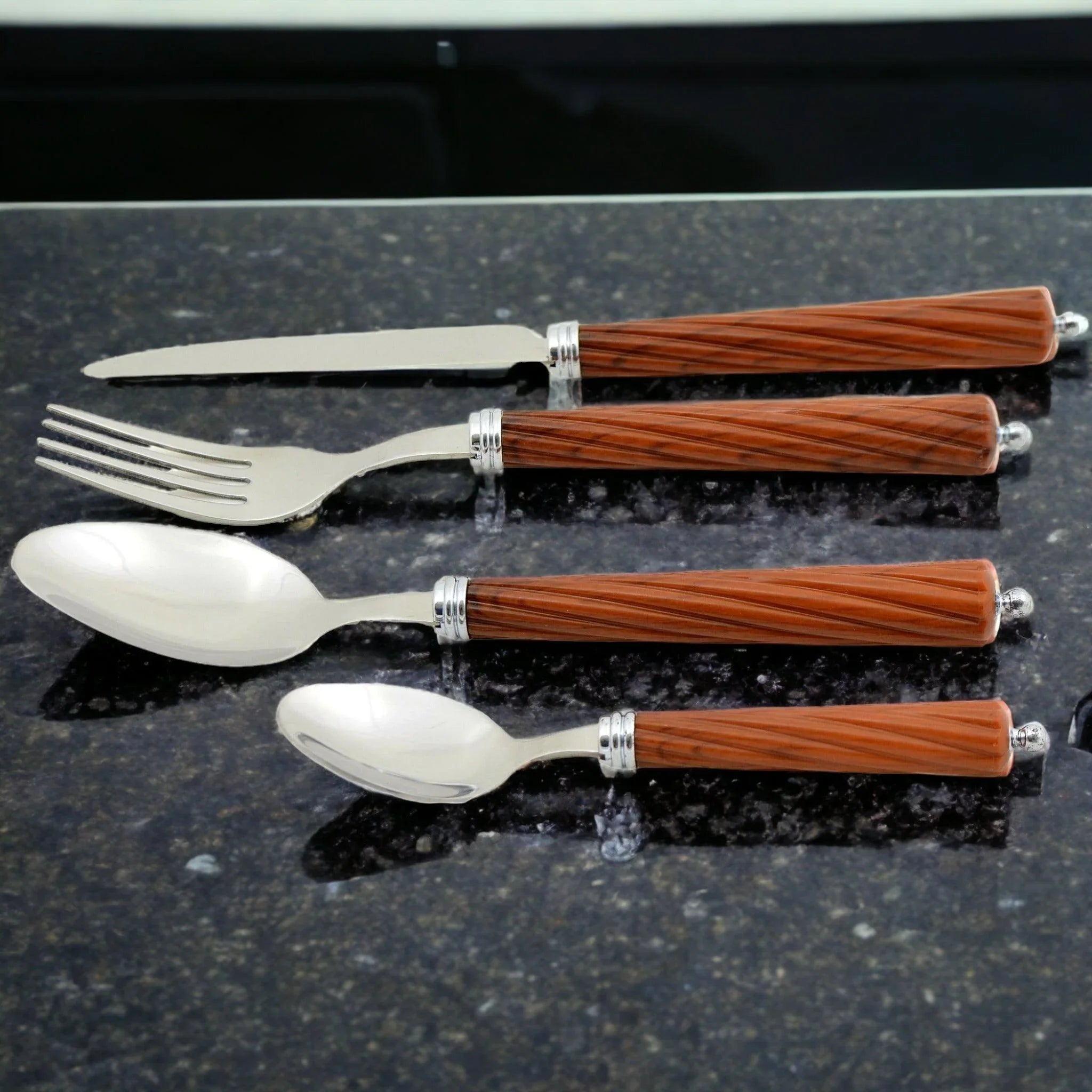 A stunning 24-piece Flatware Set with Dark Wood-finished Handles.