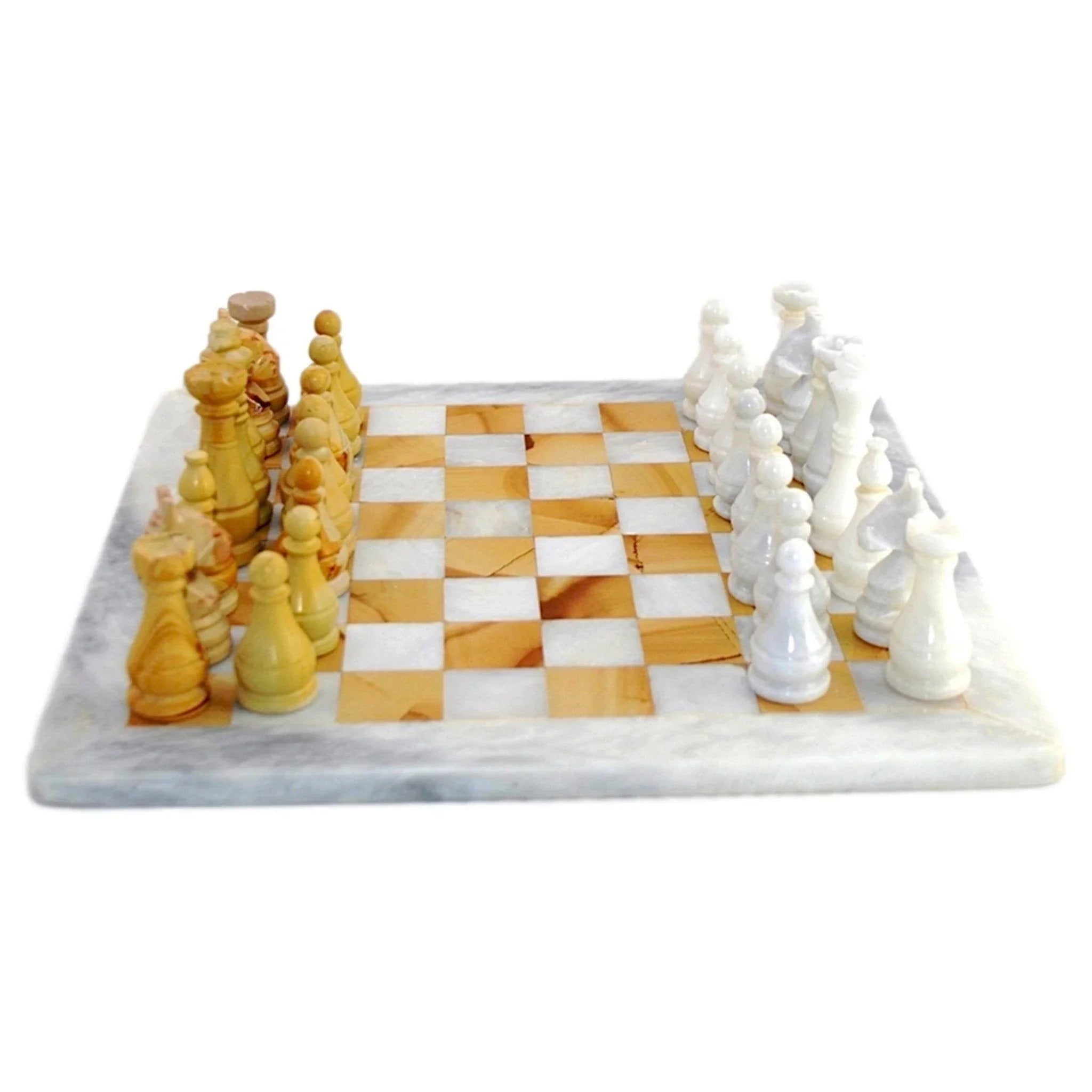 Intricately handcrafted and polished with exacting precision, this marble chess set offers a luxurious blend of elegance, decorative flair and functionality. It will elevate the aesthetic of its environs and captivate onlookers, leaving them in awe of its beauty.