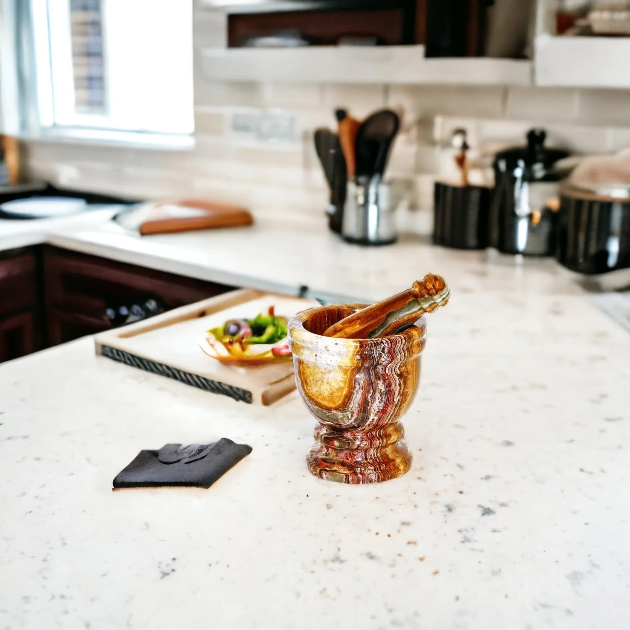 Aside from its practical functionality, the Marble Mortar and Pestle crafted from Multi Brown Onyx adds a touch of sophistication to your kitchen decor. The natural marble patterns, coupled with the carefully polished finish, create a stunning aesthetic that complements any kitchen style, be it modern, rustic, or traditional. It serves as a beautiful display piece, enticing guests with its timeless allure.