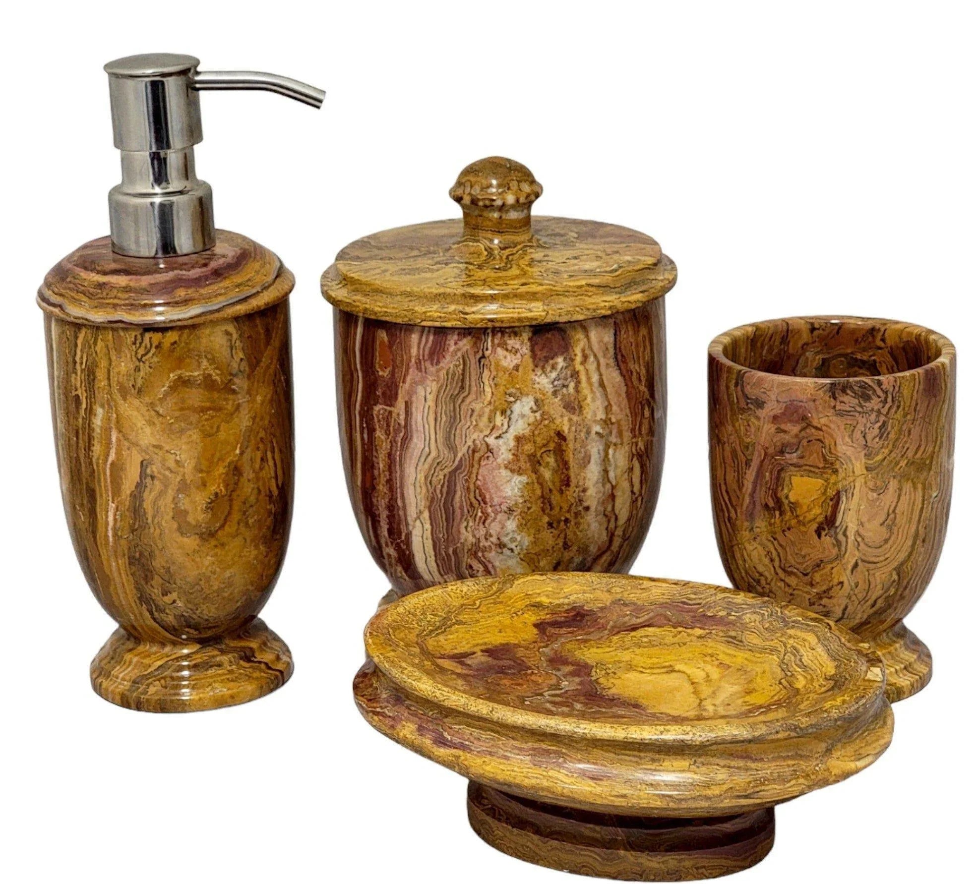 Crafted from high quality Multi Brown Onyx - This four price bathroom Accessory Set is elegant, decorative and functional.