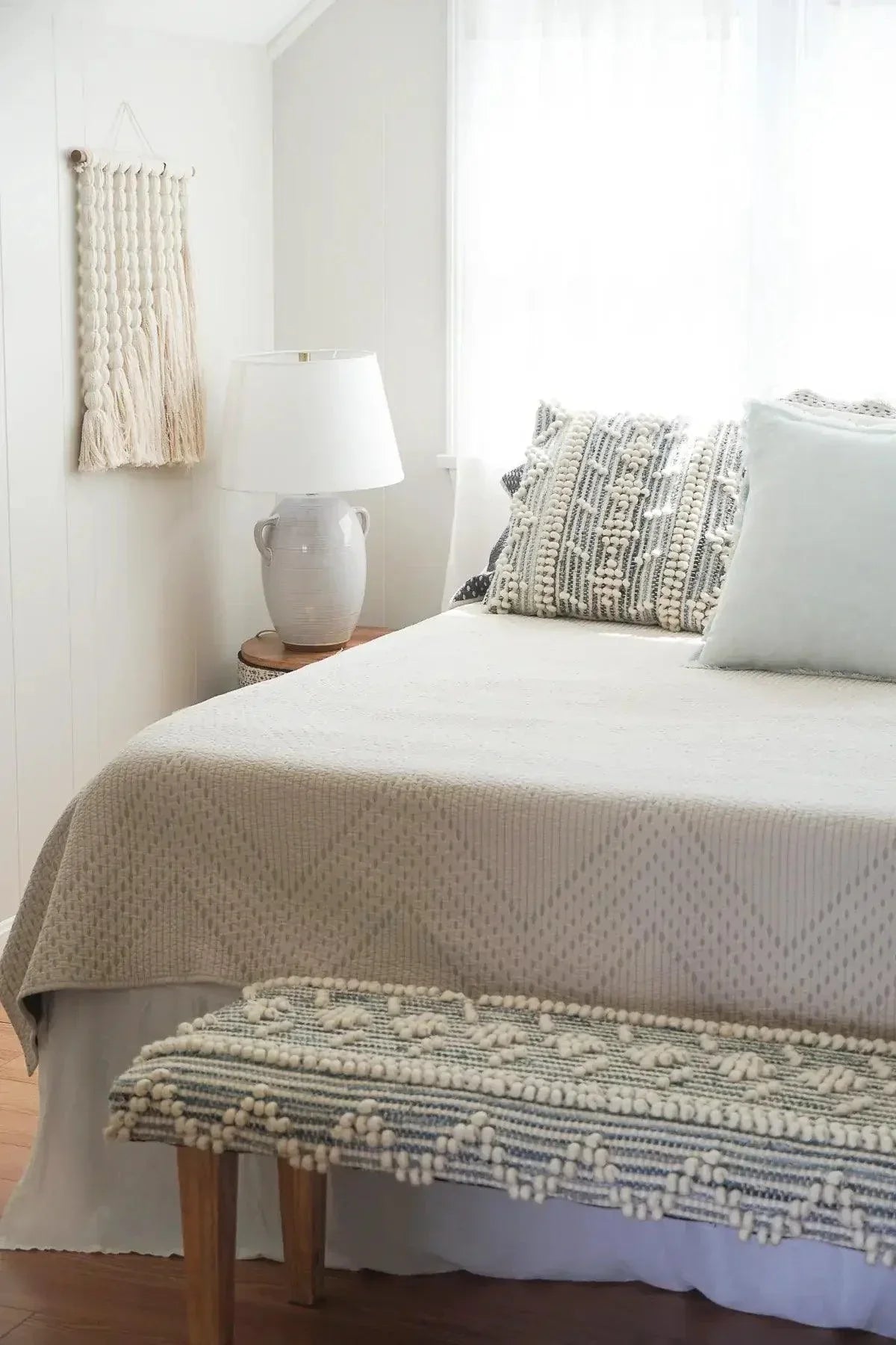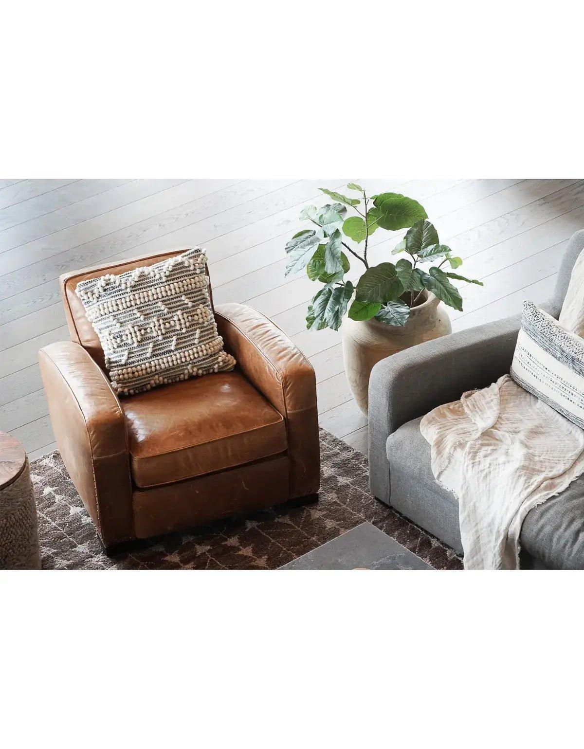 Instead of discarding surplus denim, we recycle and repurpose it into strips that are handcrafted into an alluring pattern and employed to craft the Handwoven Recycled Denim Pillow and accompanying bench - available for separate purchase.