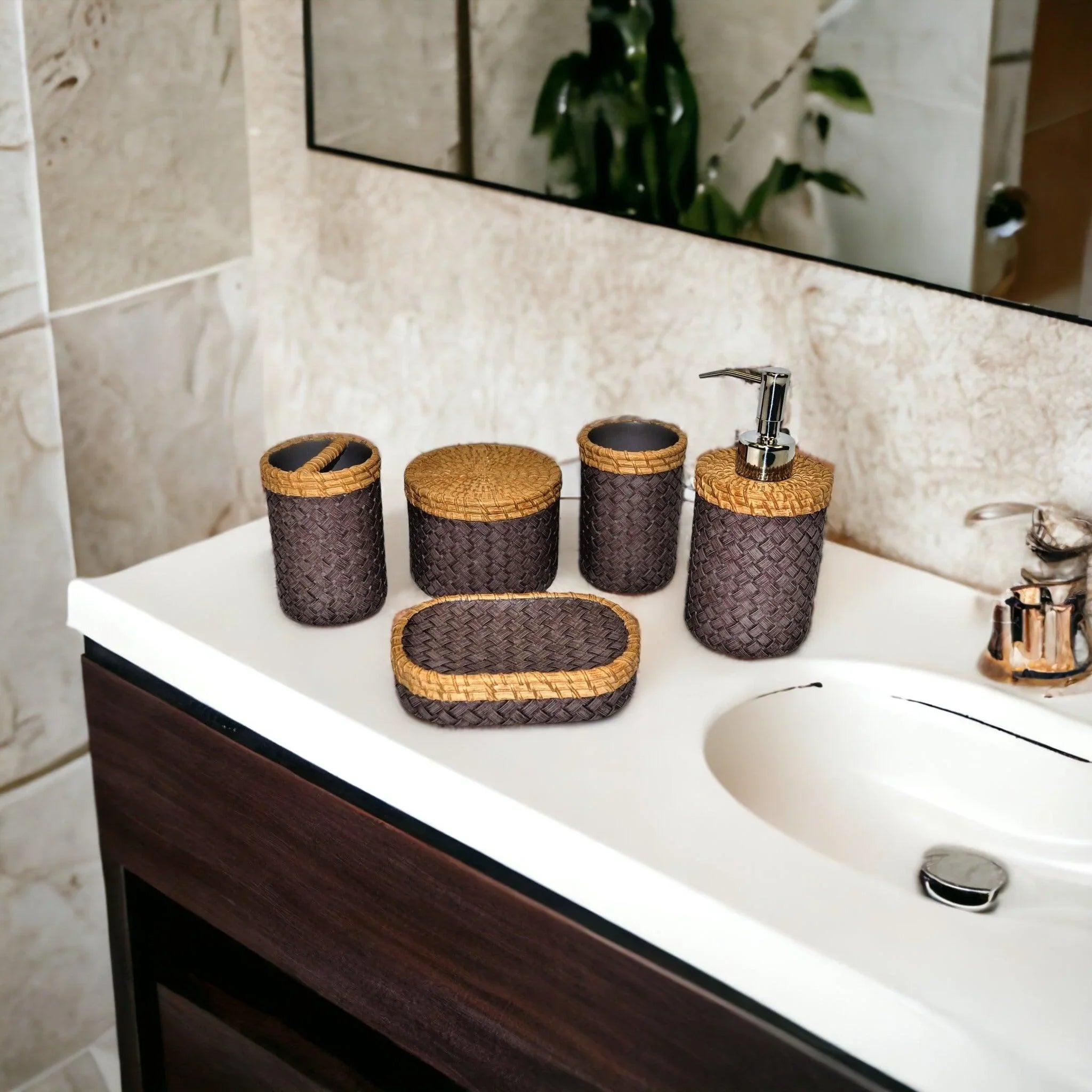 This unique bathroom accessories set includes one piece each of
