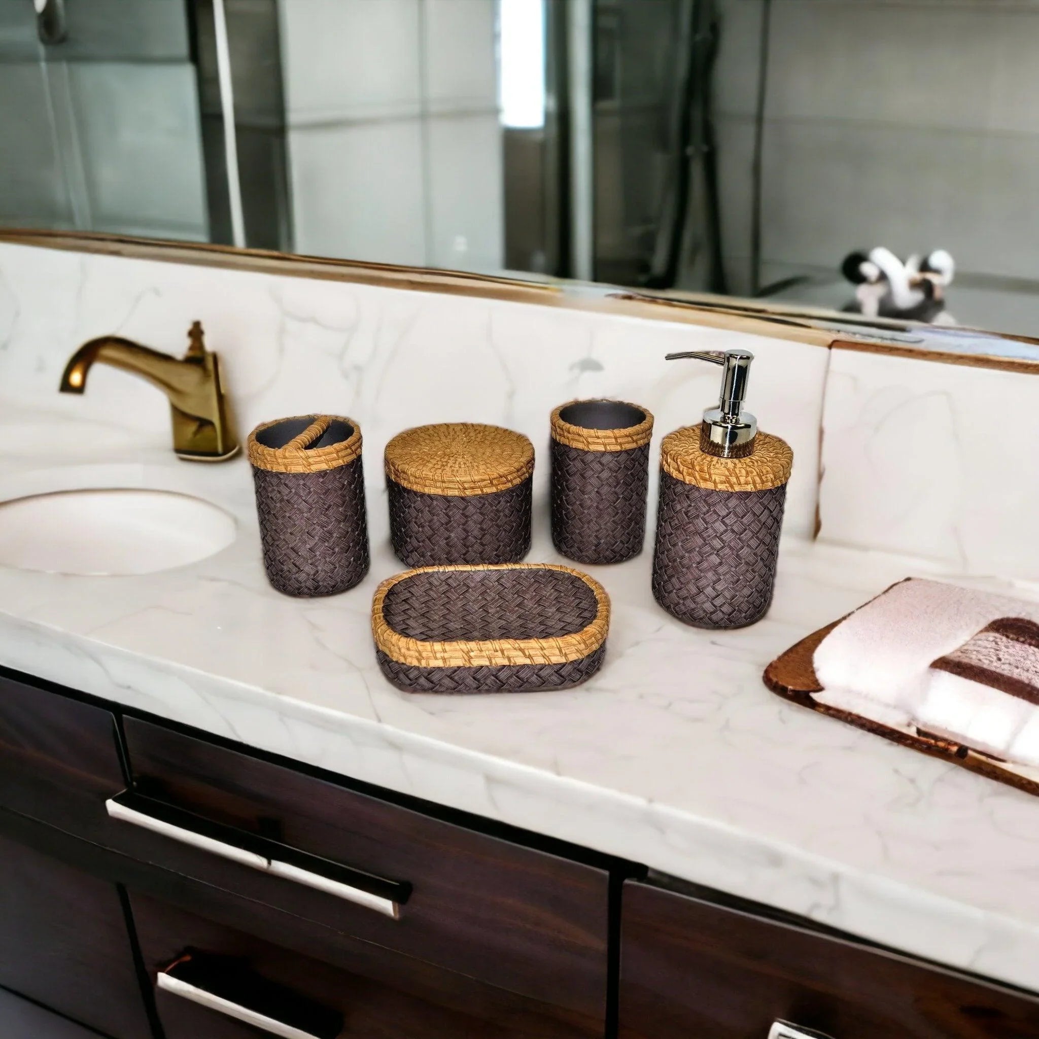 Delicately crafted with intricate weaving and an exquisite blend of refined colors, this set will add a touch of luxury to your bathroom. Transcend into the realm of elegance with these timeless pieces and transform your bathroom into a work of art.