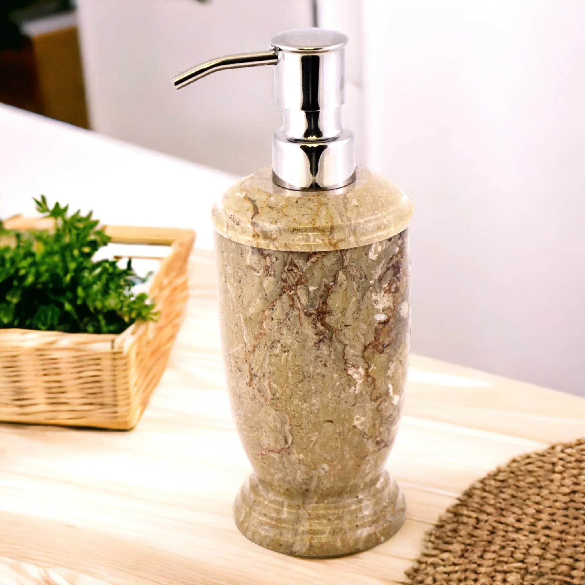 Nature Home Decor's Atlantic Collection is proud to offer you the Sahara Beige Marble Lotion / Liquid Soap Dispenser! This fancy fixture is equipped with a removable plastic bottle for quick refills and a pump made with super-durable, corrosion-resistant stainless steel. So ready your decor for a glitzy upgrade!