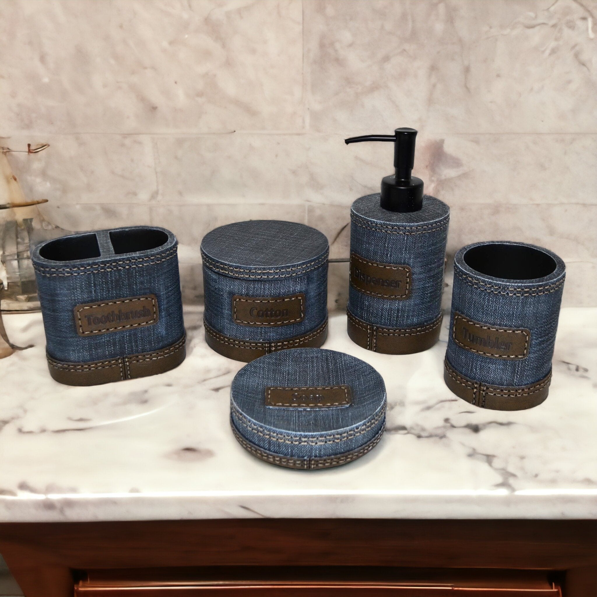 Unique Bathroom Accessory Set of Denim Finish