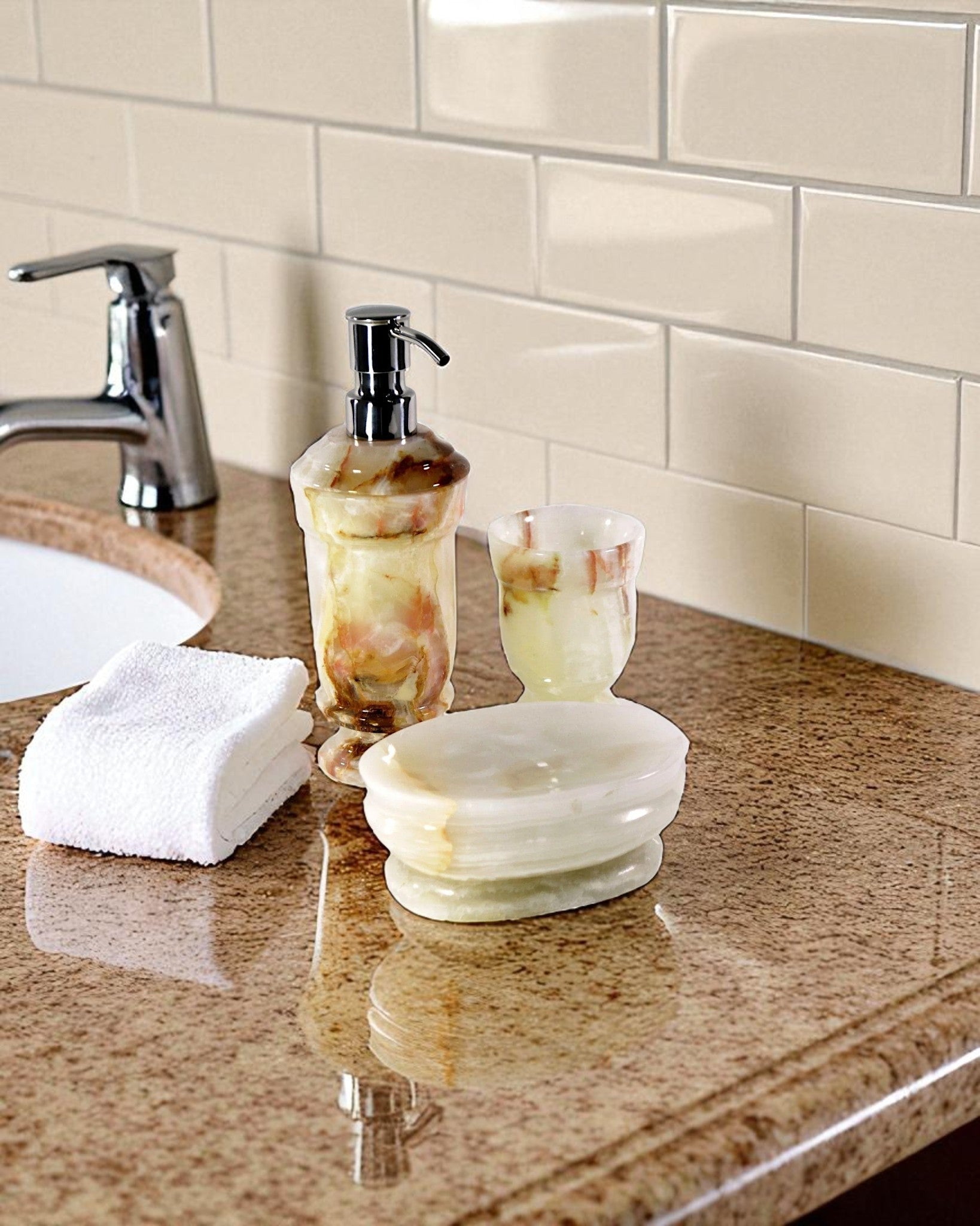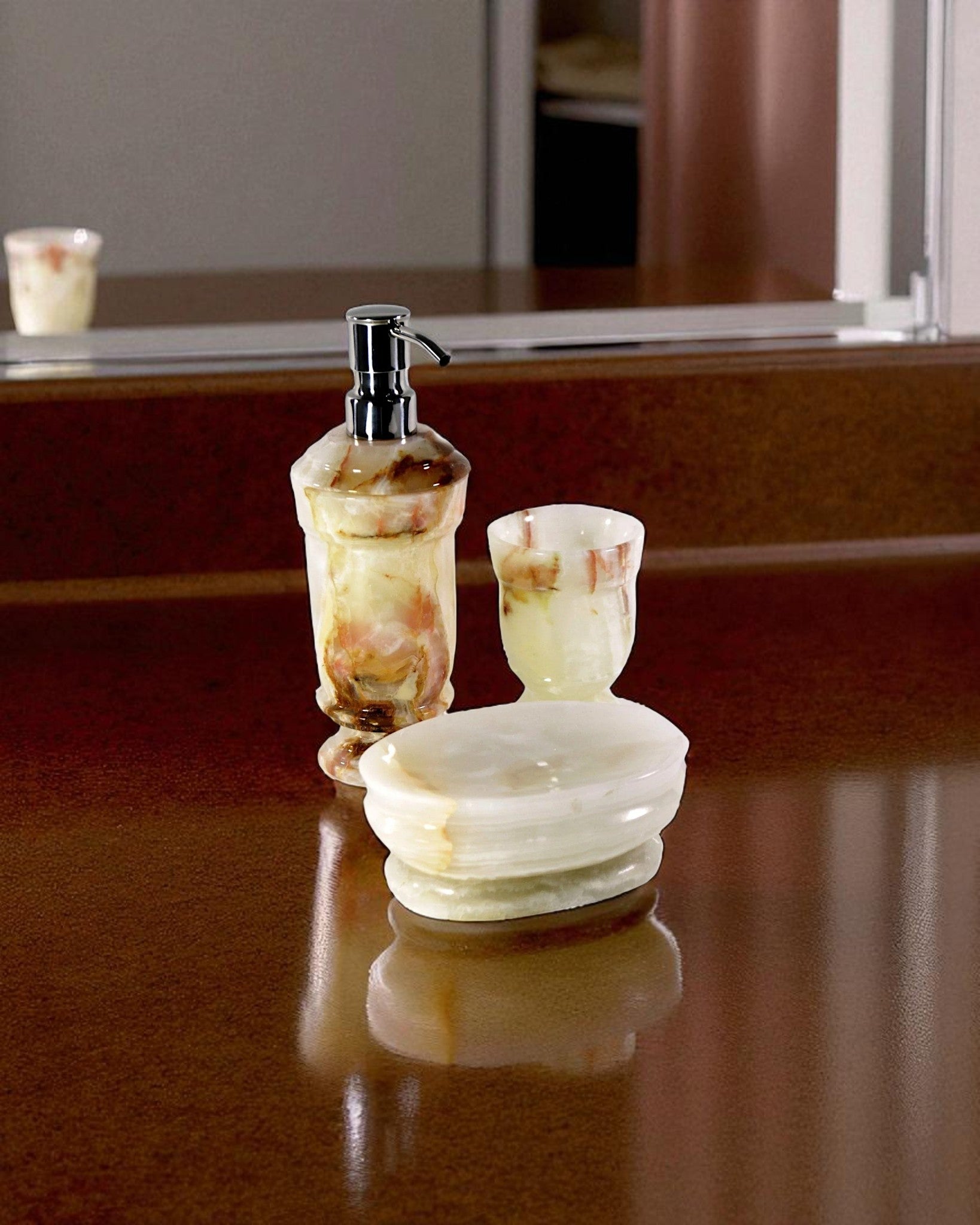 Crafted to high grade of translucent White Onyx this 3-Piece Bathroom Accessory Set is part of the Tasmanian Design Collection offered by Nature Home Decor.Set includes one piece each of the following items.